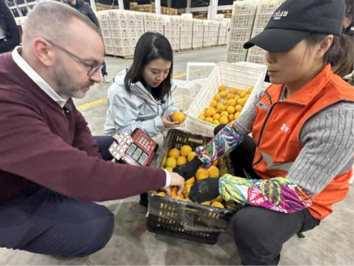 世界粮食计划署中国办公室副主任柯世明(左一)体验脐橙装箱