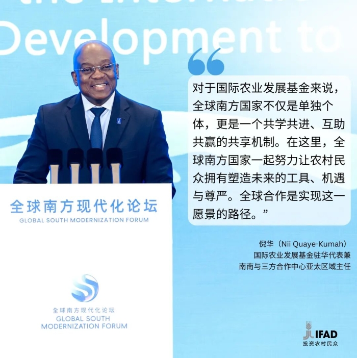 论坛聚焦全球南方国家现代化建设与经验互鉴,推动构建人类命运共同体。IFAD坚信合作的力量,正如倪华先生在会上所强调:“对于国际农业发展基金来说,全球南方国家不仅是单独个体,更是一个共学共进、互助共赢的共享机制。在这里,全球南方国家一起努力让农村民众拥有塑造未来的工具、机遇与尊严,而全球合作正是实现这一愿景的强大动力。”