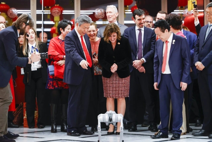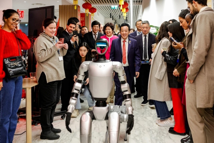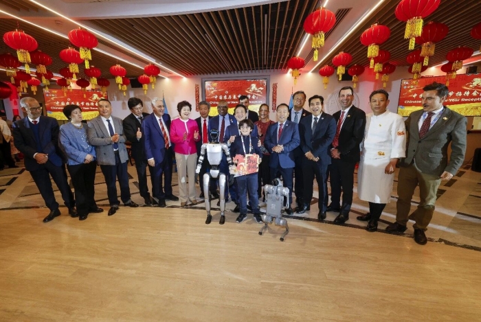 招待会开场别具新意。在来自中国的人形机器人和灵动机器狗开路引导下,屈总干事和嘉宾步入主会场,展现出粮农组织拥抱数字化与科技创新的开放姿态。科技元素与传统节庆氛围相映成趣,为火马新岁增添现代活力。