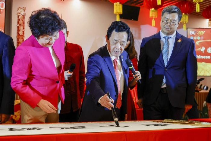 互动环节“马年抓福马、同书一笔春”欢声笑语不断。屈总干事现场抽取八位属马“幸运嘉宾”参与中国传统投壶游戏,在轻松热烈的氛围中传递新春祝福。随后,屈总干事与中外嘉宾、粮农组织高管共同参与书法体验,在一撇一捺间感受中华文化的深厚底蕴。屈总干事挥毫点题,与嘉宾共同书就“火马丰年吉祥,四个更好如意”,将现场气氛推向高潮。