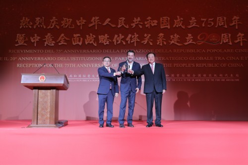 当地时间9月17日晚,中国驻意大利大使馆与中国常驻联合国粮农机构代表处共同在罗马举办庆祝中华人民共和国成立75周年暨中意全面战略伙伴关系建立20周年招待会。中国驻意大利大使贾桂德,中国常驻联合国粮农机构代表、大使广德福,意大利副总理马泰奥·萨尔维尼出席活动并致辞,在意各国外交使节、联合国粮农三机构(以下简称“RBA”)高级官员、旅意华侨华人、中资机构及留学生代表800余人出席招待会。