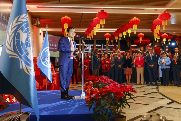 在热烈的掌声中,屈总干事发表了热情洋溢的新春致辞。他表示,春节自古承载着人们对和平与安宁的美好向往。如今,全球已有近20个国家将春节作为法定节假日,全球约1/5的人口以不同形式庆祝农历新年。春节成为联合国假日,充分彰显了中华文明对世界文化多样性的独特贡献,其所蕴含的价值理念与人文关怀,跨越国界和文化差异,赢得世界各国人民的广泛共鸣。