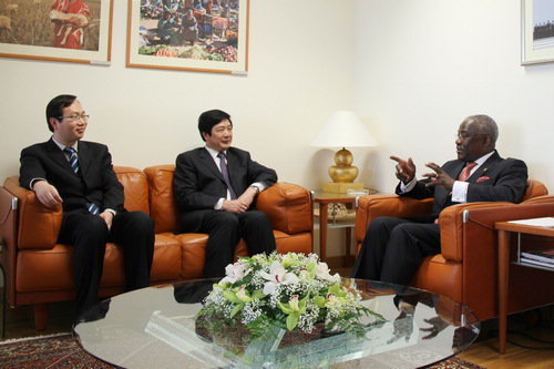 2013年4月8日上午,粮代处夏敬源代表、张政伟参赞在国际农发基金(IFAD)总部与内旺泽总裁进行了工作会谈。IFAD合作与筹资办公室亚太区负责人及总裁特别顾问吴晋康、亚太项目局局长Hoonae Kim、中国项目经理Sana Jatta。