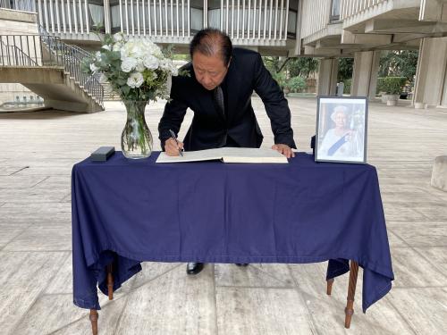 广德福在吊唁簿上写道:沉痛悼念伊丽莎白二世女王,中英两国人民友谊万古长青。