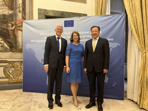 当地时间5月8日晚,中国常驻联合国粮农机构代表、大使广德福应欧盟驻联合国粮农机构代表、大使亚历珊德拉·瓦肯博格邀请,出席了欧洲日招待会活动。