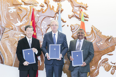 2018年12月6日,中国常驻联合国粮农机构代表牛盾大使、FAO副总干事古斯塔夫森、斯里兰卡农业部常务秘书卢旺共同出席在FAO总部举行的中国-斯里兰卡-FAO南南合作项目签字仪式。