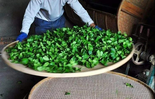 铁观音茶需要采摘叶片已全部展开,形成驻芽的叶片,俗称“开面采”。采摘下来的铁观音鲜叶通过晒青、晾青进入做青阶段,做青是摇青与摊放交替进行的过程。摇青使叶子边缘经过摩擦,叶缘细胞受损(氧化后形成绿叶红镶边的特征),再经过摊放,在一定的温度、湿度条件下伴随着叶子水分逐渐丧失,叶中多酚类在酶的作用下缓慢氧化并引起了一系列化学变化,从而形成乌龙茶的特有品质。随后进入炒青、包揉、干燥等工序。