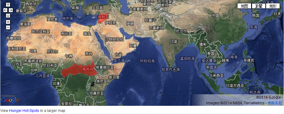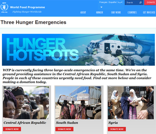 5月9日,WFP在其官方网站上发布了饥饿热点地图。WFP宣布,目前全球共同面临着三个重大人道主义突发事件的挑战。发生在中非共和国、南苏丹和叙利亚的人道主义灾难震撼了全世界,挣扎在饥饿和死亡线上的当地难民以及灾民迫切需要得到来自全世界的援助。