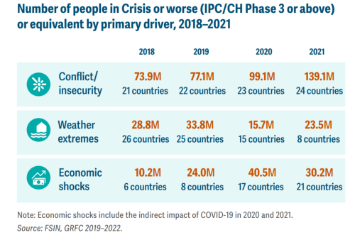 冲突仍然是造成粮食不安全的主要原因。虽然报告的分析工作在俄乌战事之前已经完成,但仍然指出这场战事暴露了全球粮食体系的相互关联性和脆弱性,全球粮食和营养安全将会受到严重影响。报告指出,受东欧战事影响最大的是那些已经面临严重饥饿的国家,主要是因为这些国家高度依赖粮食和农业生产资料的进口,一旦全球粮食价格上涨,将首当其冲受到冲击。